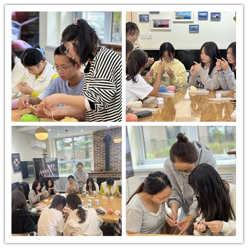 活动中,丁立华老师和两位助理学生教同学们从基础针法入手,细致演示起针、短针、长针等关键技巧,手把手指导同学们完成基础钩针作品。从最初的生疏到渐入佳境,大家在穿针引线间专注投入,1952咖啡馆内弥漫着轻松愉悦的气氛,点燃的壁炉更为活动增添了人间烟火气。两小时的沉浸式体验后,一幅幅灵动的绒线作品逐渐成型,同学们不仅收获了手工创作的成就感,更在专注过程中释放了日常压力。